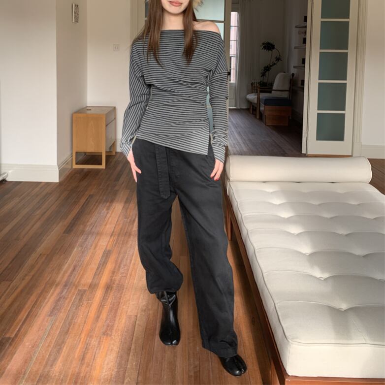 ボーダーでカジュアルな印象ながらも、オフショルダーデザインで女性らしさを演出します。サイドにファスナーが付いており、ご自身のお好みでスリット部分を調節していただけます。 ■カラー gray ■サイズ S 胸囲:96cm 着丈:67cm 袖丈:69cm M 胸囲:100cm 着丈:68cm 袖丈:71cm L 胸囲:104cm 着丈:69cm 袖丈:73cm ※海外製品につき若干の誤差がある場合がございます。 model▶ 163cm 45㎏ Sサイズ着用 【注意事項】 ・商品サイズが日本のサイズ規格より小さい場合がございます。 ・海外製品にて、日本の検品基準と異なるため縫製などが若干甘い場合がございます。 ・海外倉庫にて保管をしております。在庫情報に時差が生じるため在庫切れや生産中止、生産に遅れがある場合には、受注後でもキャンセルさせていただく恐れがございます。 ・商品の色味はお手持ちのスマートフォンの画面によって実物と若干異なる場合がございます。 ・イメージ違いやサイズ交換等、お客様ご都合による交換、返品の対応は出来かねます。 <お届けについて〉 海外より取り寄せ・発送となるため ご入金から1-3週間でお届けいたします。 ※ご購入前に必ずショップABOUTをご確認ください。
