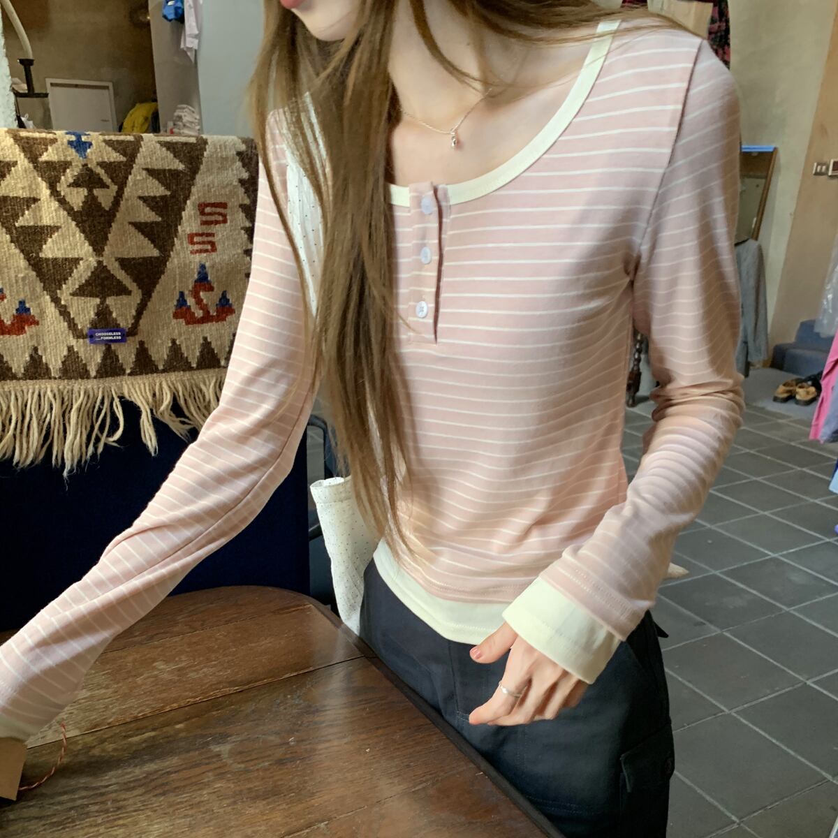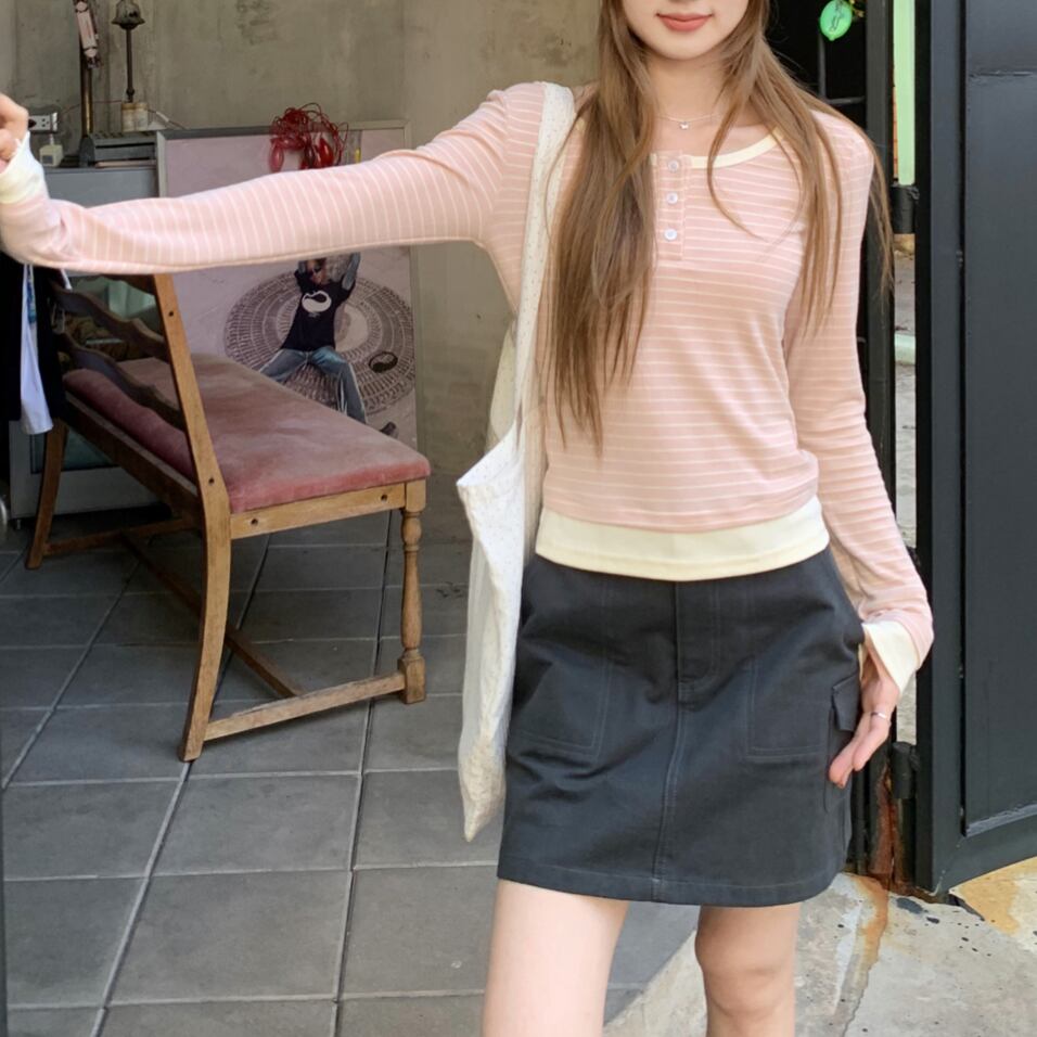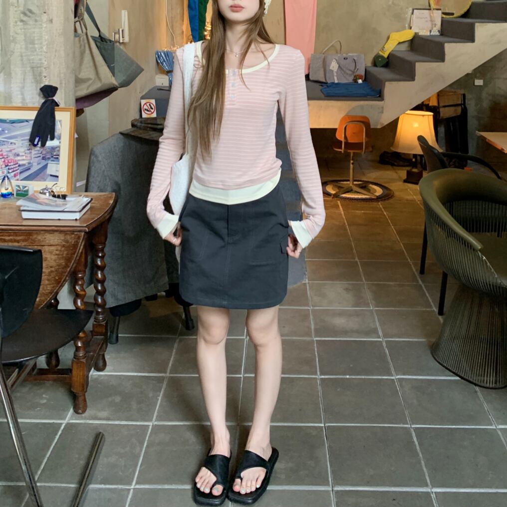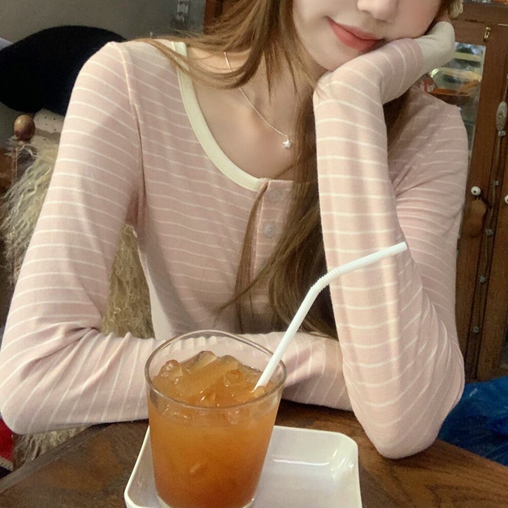 Henley Neck Striped Long Sleeve Tops 1color A0099