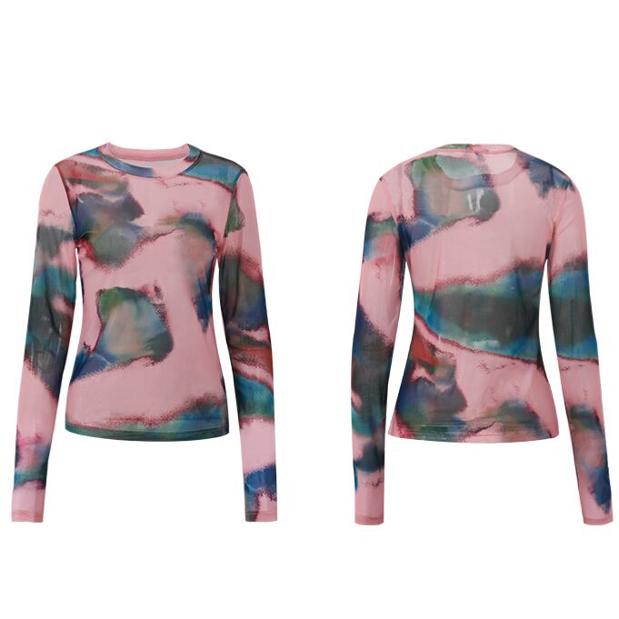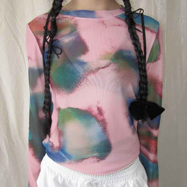 Abstract Pattern Mesh Long Sleeve Cropped Top 1color A0191