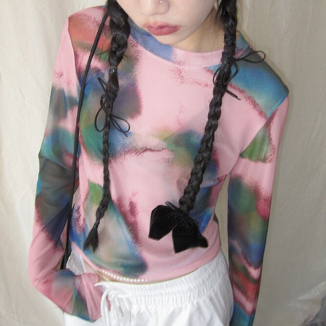 抽象的なパターンが目を惹くメッシュ素材のクロップドトップ*