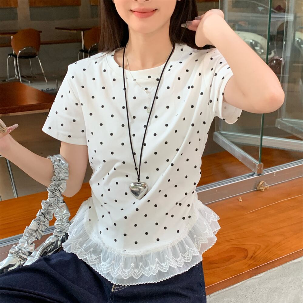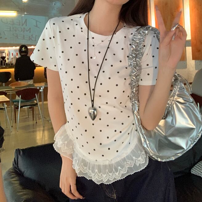 ドット柄と繊細なレースの組み合わせが可愛いTシャツです* 裾のレースがポイントになって、カジュアルだけど女性らしい着こなしが叶います♪ 一枚で着ても、デニムやスカートと合わせても◎様々なスタイルにマッチするので、着回し力抜群です! ■カラー white ■サイズ S 肩幅:34cm 胸囲:80cm 着丈:53cm 袖丈:13cm M 肩幅:35cm 胸囲:84cm 着丈:54cm 袖丈:14cm L 肩幅:36cm 胸囲:86cm 着丈:56cm 袖丈:15cm ※海外製品につき若干の誤差がある場合がございます。 <お届けについて〉 海外より取り寄せ・発送となるため ご入金から1-3週間でお届けいたします。 ※ご購入前に必ずショップABOUTをご確認ください。 【注意事項】 ・商品サイズが日本のサイズ規格より小さい場合がございます。 ・海外製品にて、日本の検品基準と異なるため縫製などが若干甘い場合がございます。 ・海外倉庫にて保管をしております。在庫情報に時差が生じるため在庫切れや生産中止、生産に遅れがある場合には、受注後でもキャンセルさせていただく恐れがございます。 ・商品の色味はお手持ちのスマートフォンの画面によって実物と若干異なる場合がございます。 ・イメージ違いやサイズ交換等、お客様ご都合による交換、返品の対応は出来かねます。