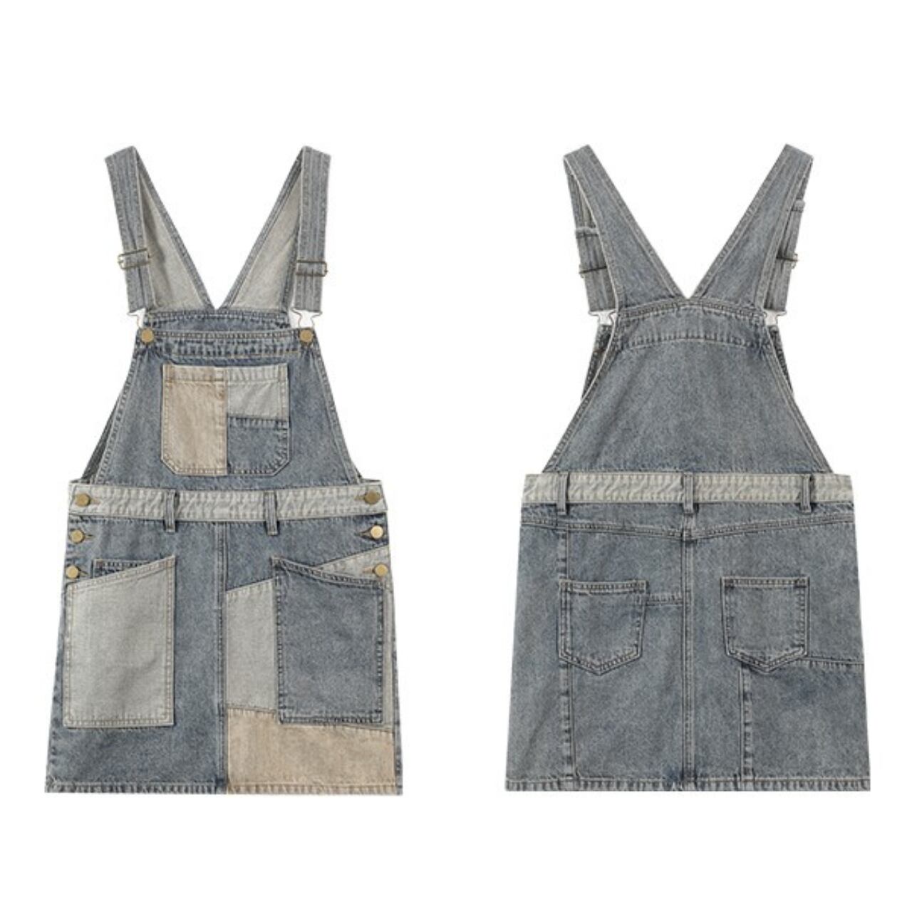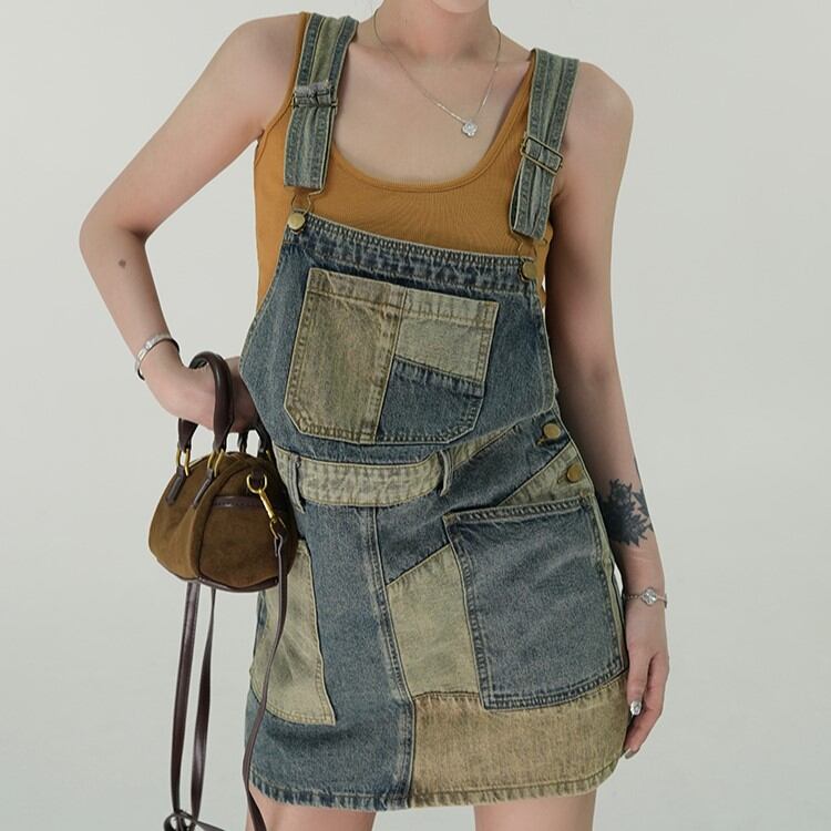 パッチワークデニムのAラインシルエットミニ丈サロペットスカートです*
