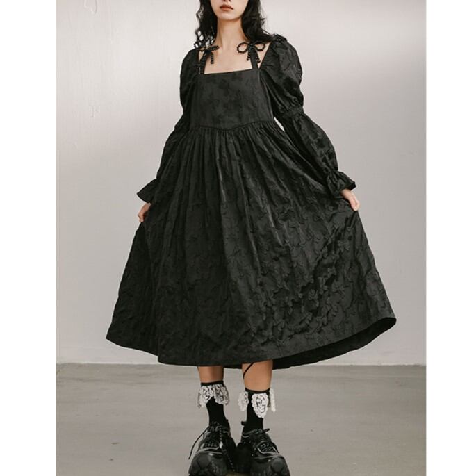 パフスリーブとスクエアネックが可愛いロングワンピース。上品なデザインなので、デートやパーティーなど特別な日にぴったりです* リボン付きのストラップがアクセントになり、シンプルなデザインながらも華やかさを演出します。 様々なコーディネートを楽しめる、着回し力も魅力です♪
