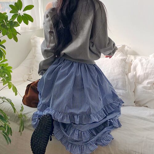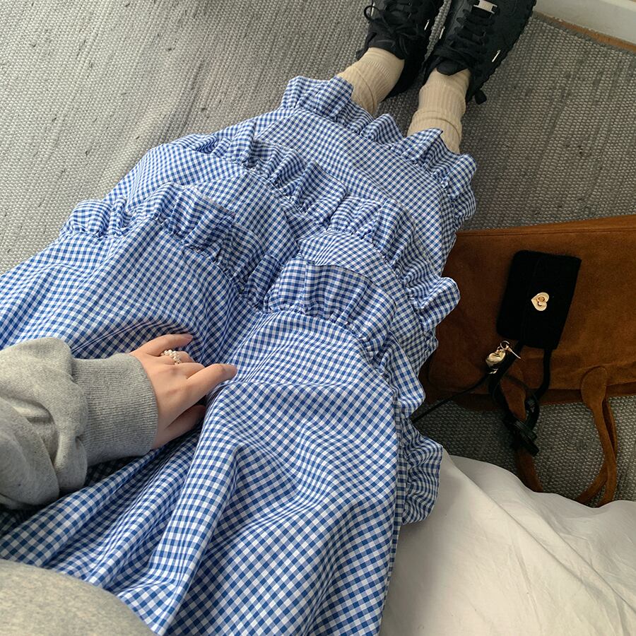 Gingham Check Long Flared Tiered Skirt 1color A0022